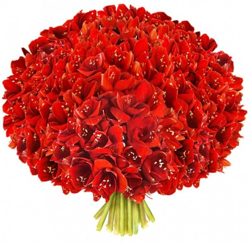 Букет состоит из 45 красных амариллисов, прозрачная упаковка, атласная лента.
