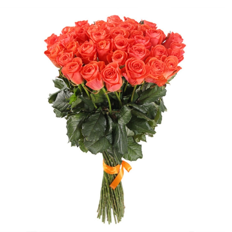 Букет состоит из 55 коралловых роз, прозрачная упаковка, атласная лента.