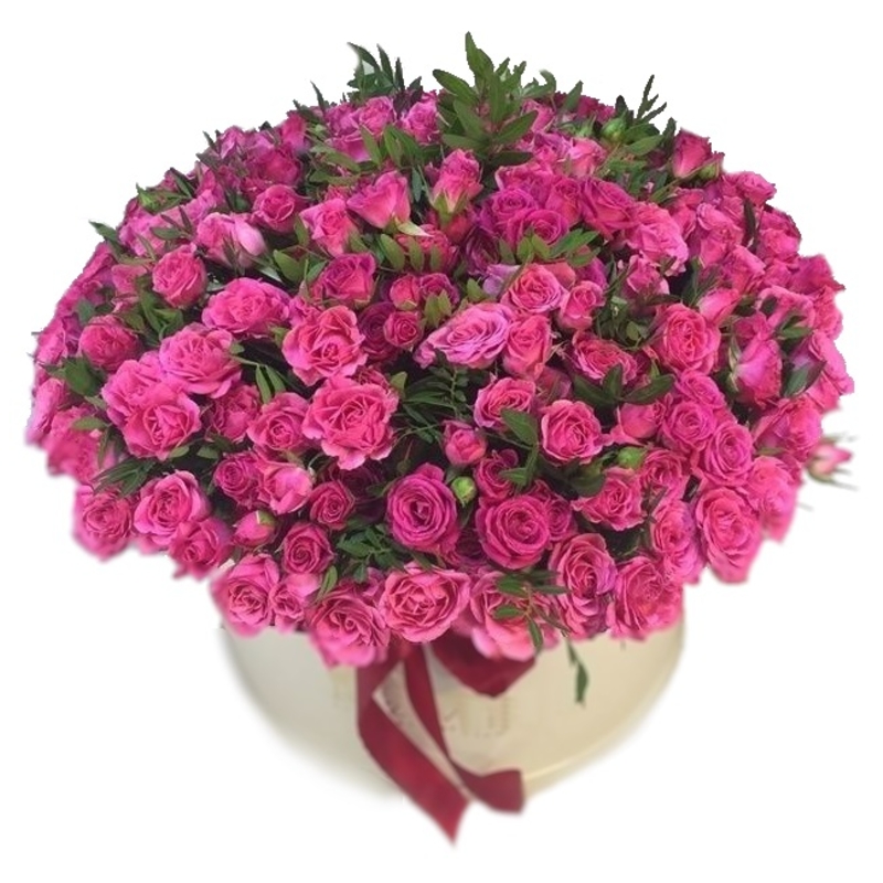 Букет состоит из 35 веток малиновых кустовых роз, зелень, коробка, оазис.