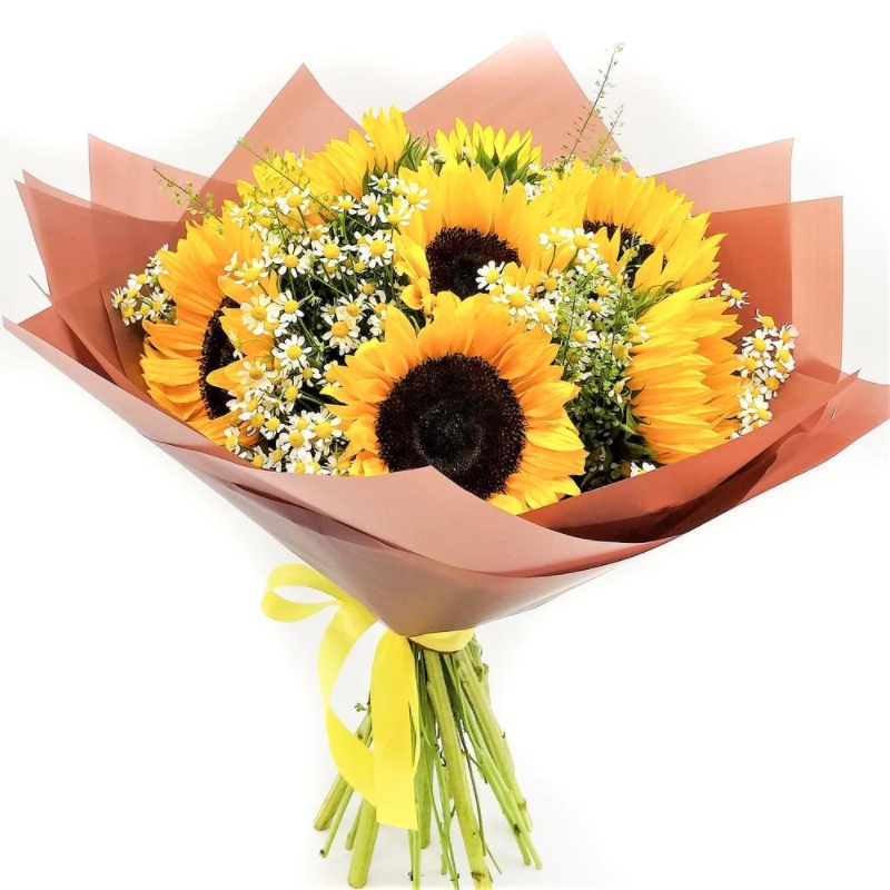 Букет состоит из 7 подсолнухов, 10 танацетум, зелень, крафт, атласная лента.